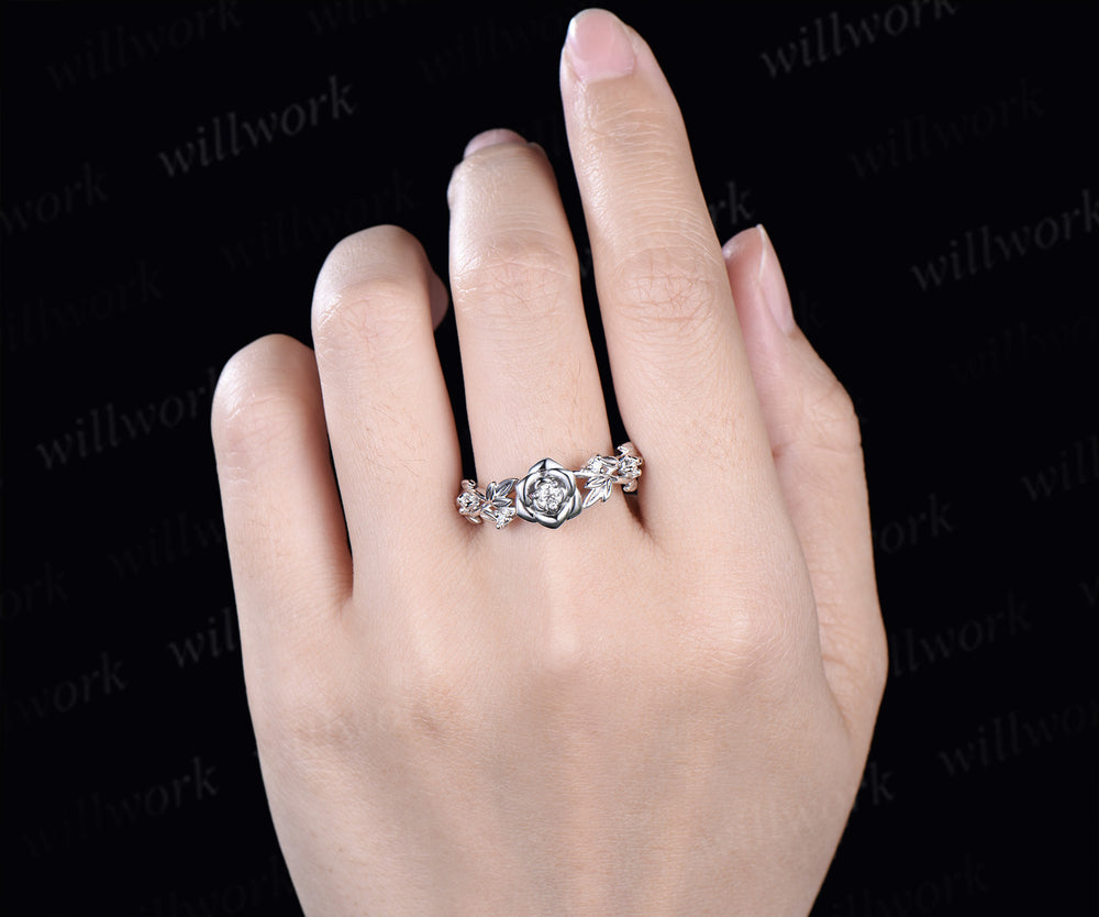 Dainty Rose Flower Natural Diamond Ring Nature Inspired Minimalist Engagement Ring Solid Gold Promise Ring