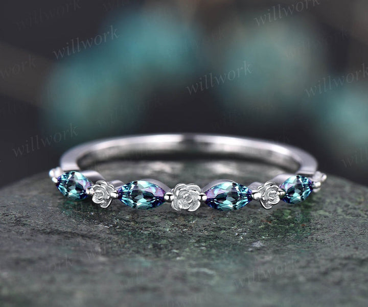 Flower marquise cut alexandrite wedding band solid 14k rose gold half eternity stacking wedding ring art deco bridal anniversary ring gift