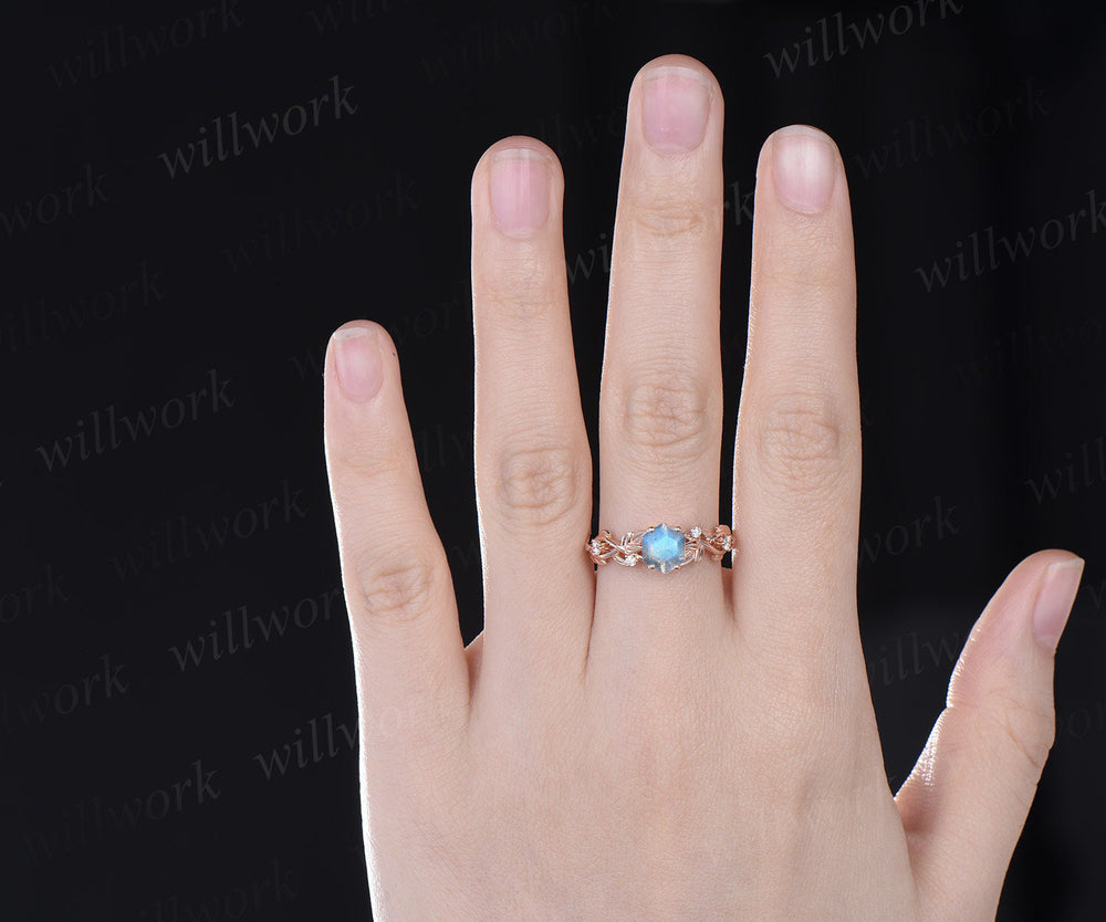 Hexagon cut blue labradorite engagement ring twig leaf moissanite ring solid 14k rose gold anniversary ring jewelry gifts