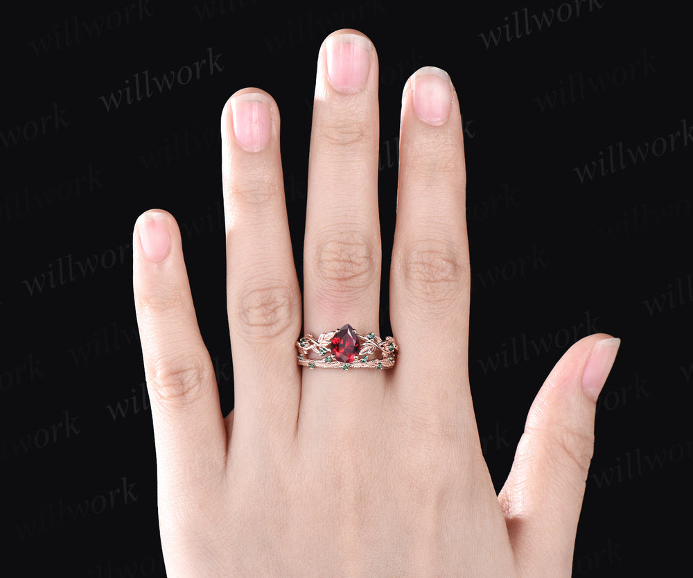July Birthstone Teardrop Ruby Engagement Ring Set Unique Round Emerald Wedding Ring Leaf Vine Twig Branch Floral Nature Inspired 2pcs Bridal Ring Set