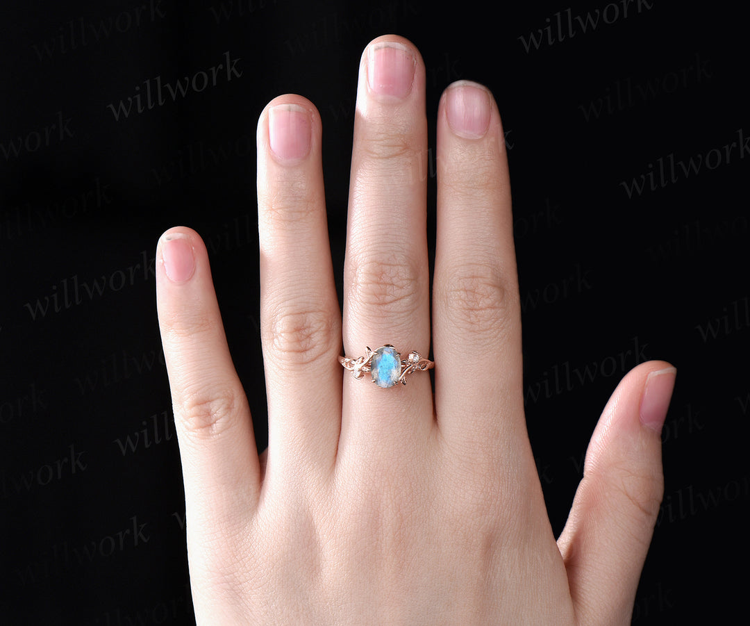 Oval cut blue labradorite engagement ring art deco moissanite leaf twig ring solid 14k rose gold alternative moonstone ring jewelry gifts