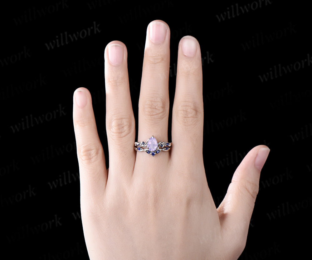 Pear cut Lavender Amethyst engagement ring 14k white gold five stone leaf branch Nature inspired blue Sapphire bridal ring set women gift