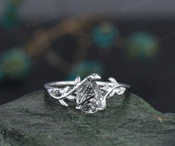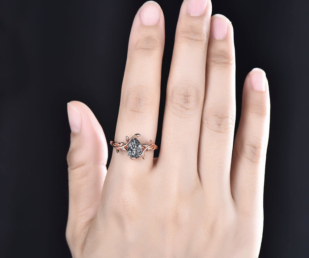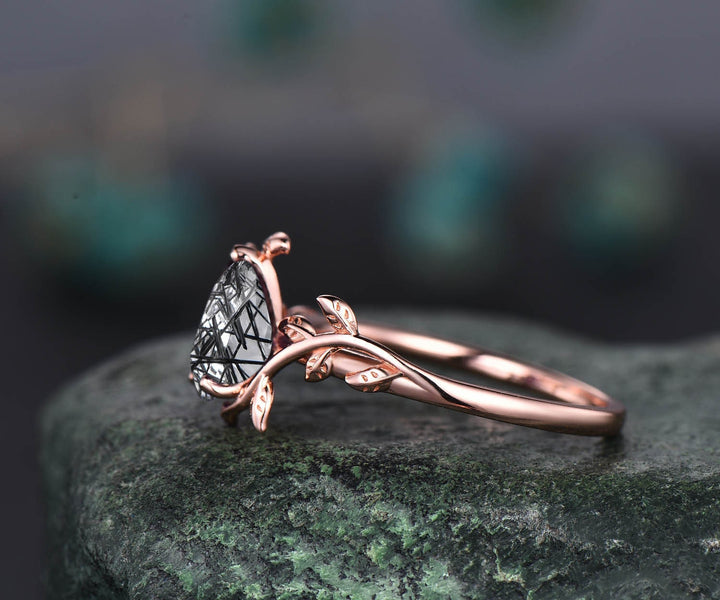 Pear shaped black rutilated quartz ring nature inspired engagement ring leaf 14k rose gold silver solitaire ring unique wedding ring women