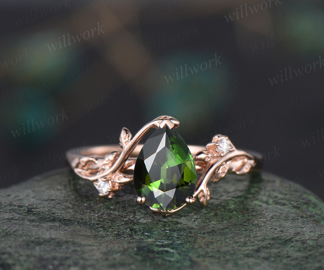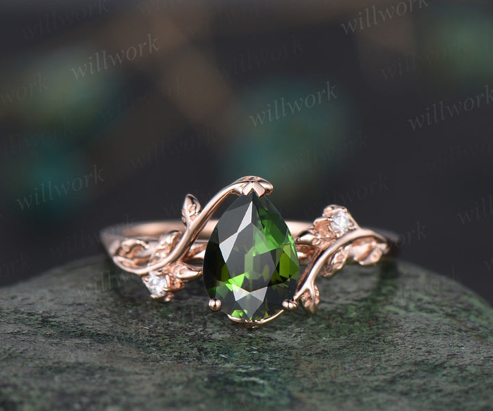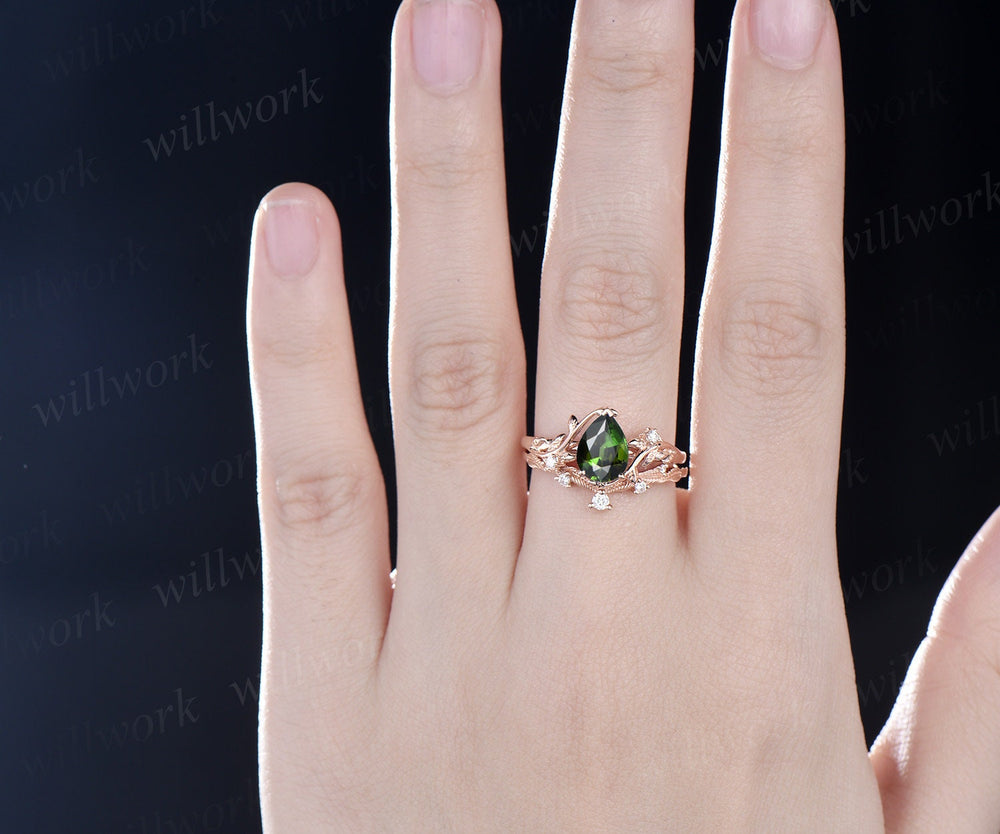 Pear shaped natural green Tourmaline ring rose gold leaf nature inspired unique engagement ring women art deco wedding bridal ring set gift