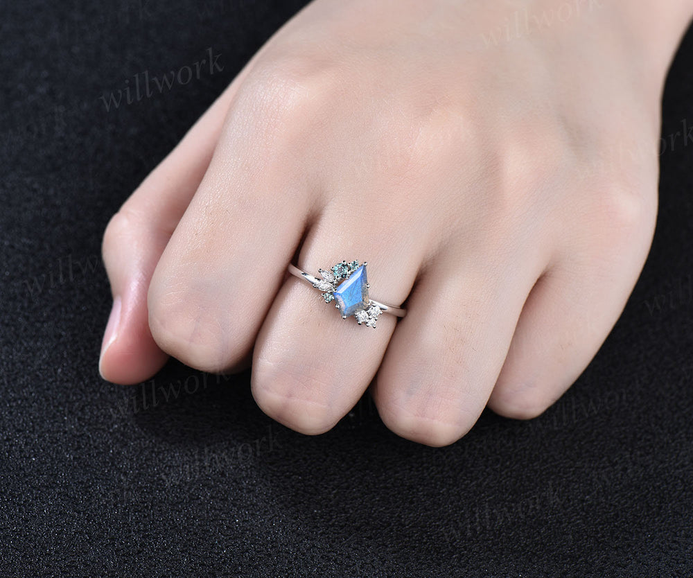 Unique kite cut labradorite engagement ring cluster alexandrite moissanite ring blue gemstone promise bridal ring handmade jewelry gifts