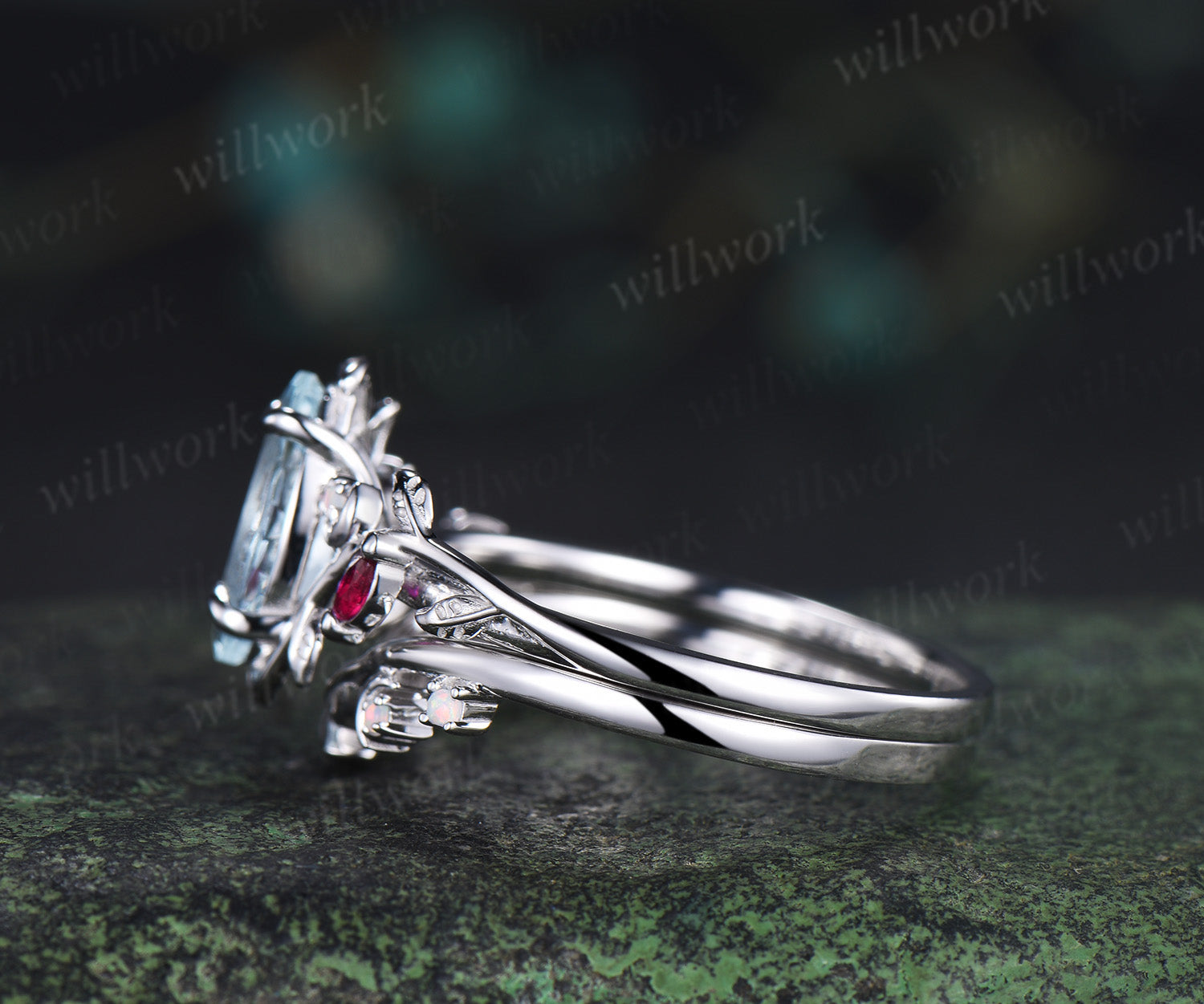 Marquise cut natural aquamarine engagement ring set leaf nature inspired ruby opal moon wedding band bridal set
