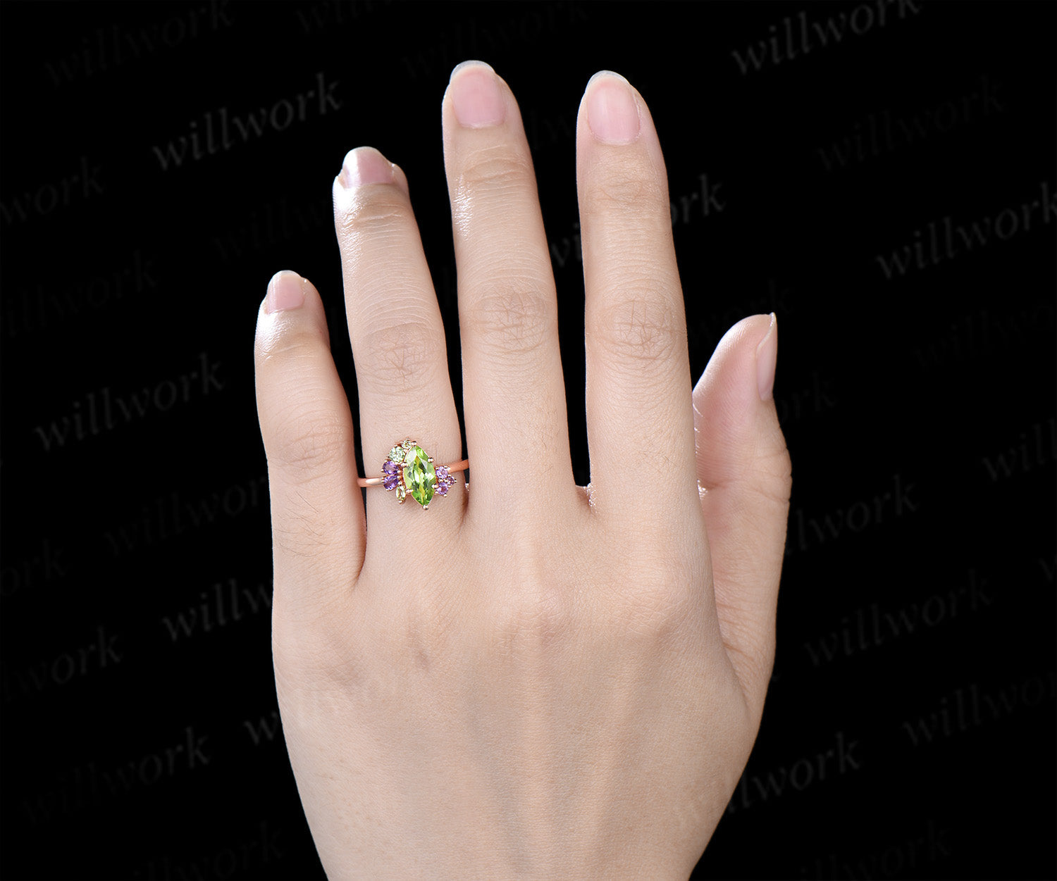 Unique marquise cut peridot engagement ring cluster peridot amethyst bridal wedding ring jewelry gifts