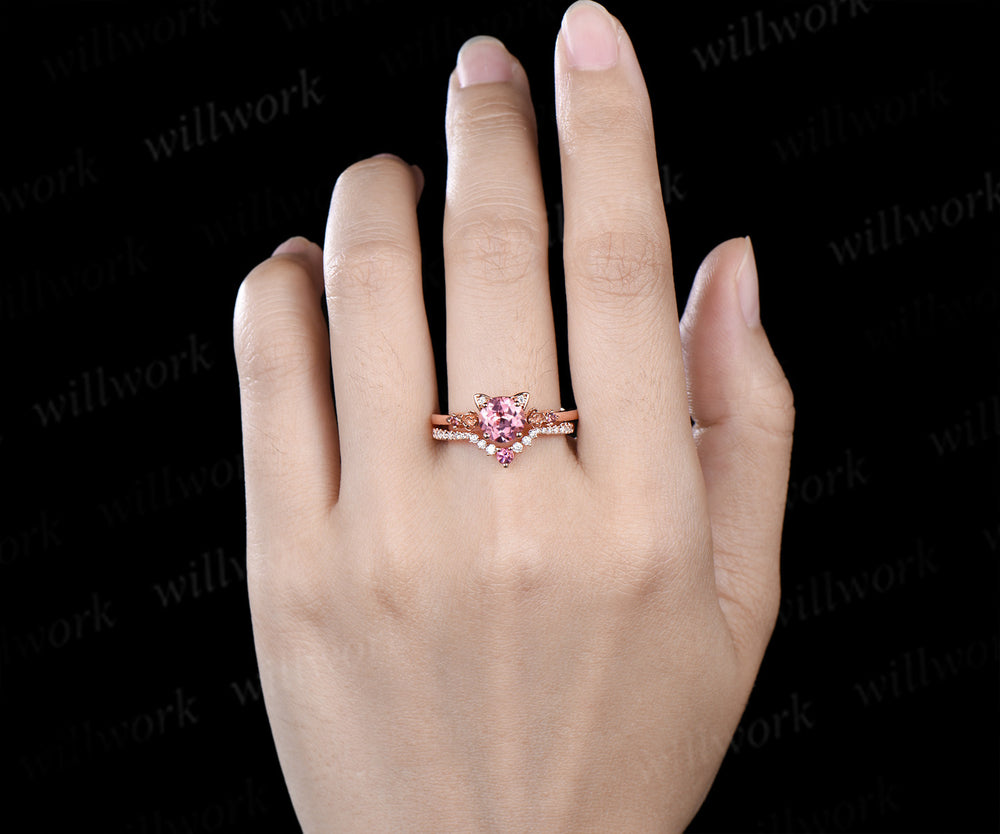 Round cut padparadscha pink sapphire engagement ring floral pink tourmaline ring wedding band cat shaped ring set gifts for women
