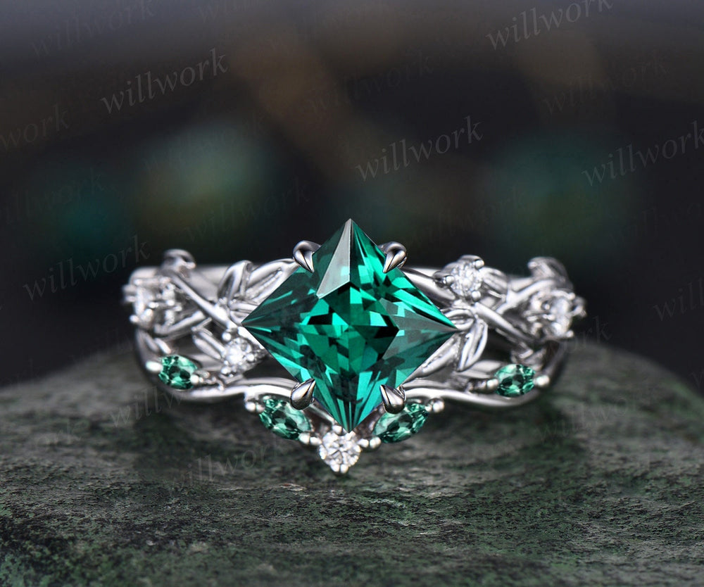 Princess cut green emerald engagement ring set 14k white gold five stone leaf branch Nature inspired ring diamond bridal ring set women gift Princess cut green emerald engagement ring set 14k white gold five stone leaf branch Nature inspired ring diamond bridal ring set women gift $492.00