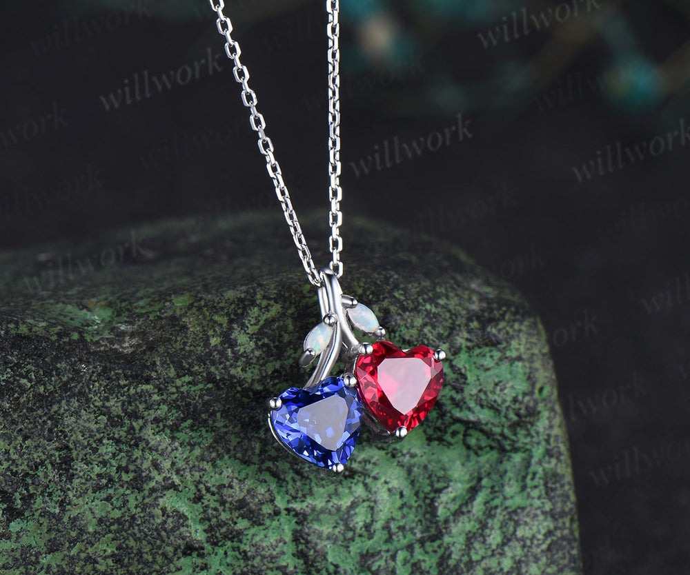 Double heart shaped sapphire ruby Necklace 14k white gold four stone Pendant Birthstone Gift Double heart shaped sapphire ruby Necklace 14k white gold four stone Pendant Birthstone Gift $323.00
