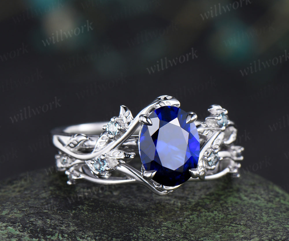 Art Deco Oval Sapphire Engagement Ring Sest Leaf Twig Branch Ring Alexandrite Split Shank Wedding Band Unique 2pc Nature Inspired Bridal Set