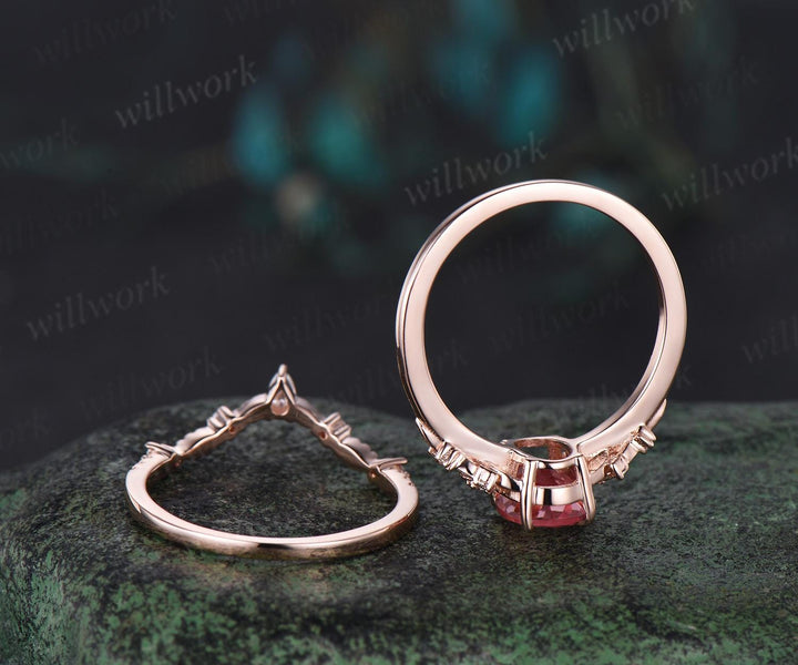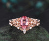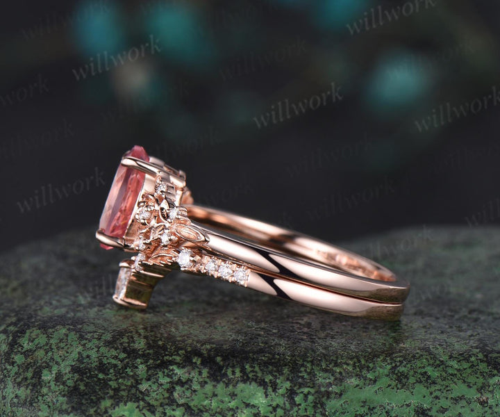 Oval cut Padparadscha pink sapphire engagement ring set leaf floral nature inspired diamond wedding bridal ring set women gift jewelry