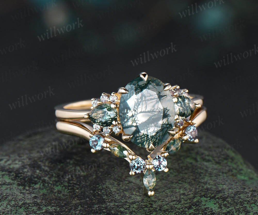 2ct oval pear moss agate engagement ring set 14k yellow gold alexandrite stacking bridal wedding ring set women 6 prong