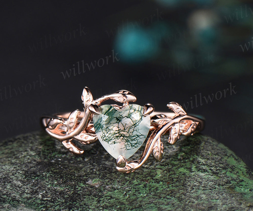 Heart shaped green moss agate engagement ring 14k rose gold twig leaf Solitaire wedding anniversary ring women gift