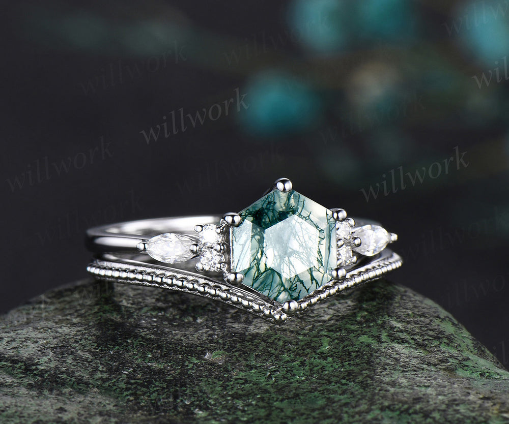 Hexagon cut natural moss agate engagement ring set 6 prong white gold moissanite stacking bridal set women