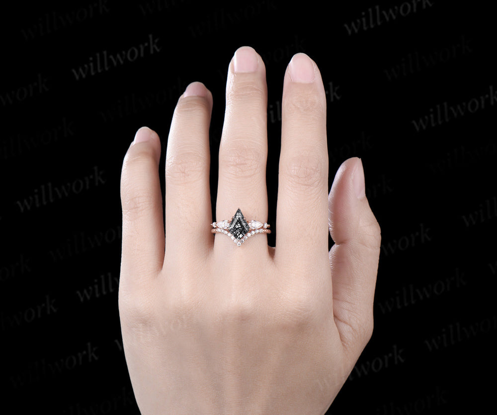Kite cut black rutilated quartz engagement ring rose gold 6 prong five stone pear diamond ring vintage promise bridal ring set women