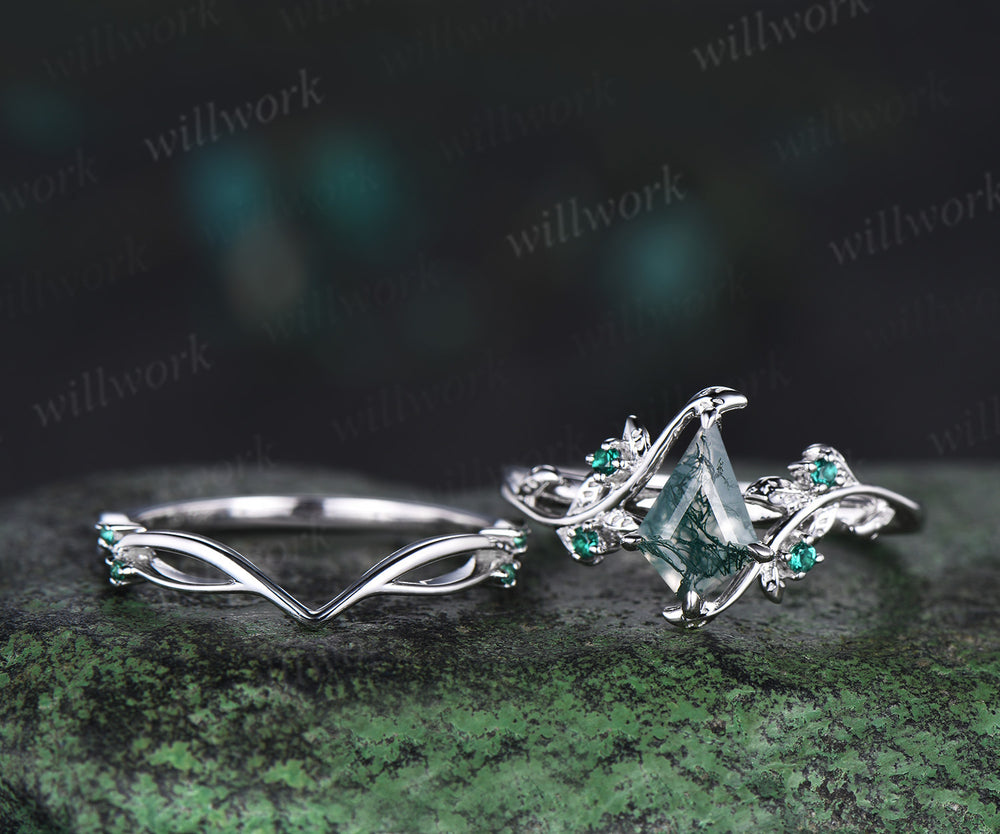 kite cut natural moss agate engagement ring set nature inspired 14k white gold twig leaf emerald wedding band bridal ring set women