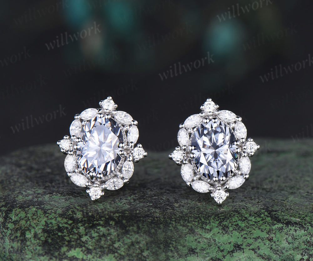 Oval cut gray moissanite earrings 14k white gold halo marquise diamond drop earrings women anniversary gift for wife