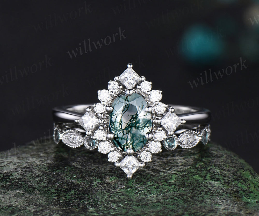 Oval cut moss agate engagement ring white gold halo princess diamond bridal ring set women alexandrite open gap wedding band