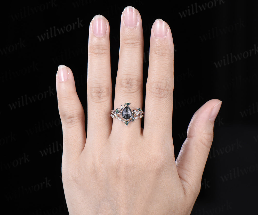 Pear salt and pepper diamond engagement ring set moss agate diamond ring vintage solid 14k white gold leaf nature inspired ring women Pear salt and pepper diamond engagement ring set moss agate diamond ring vintage solid 14k white gold leaf nature inspired ring women $2,784.00