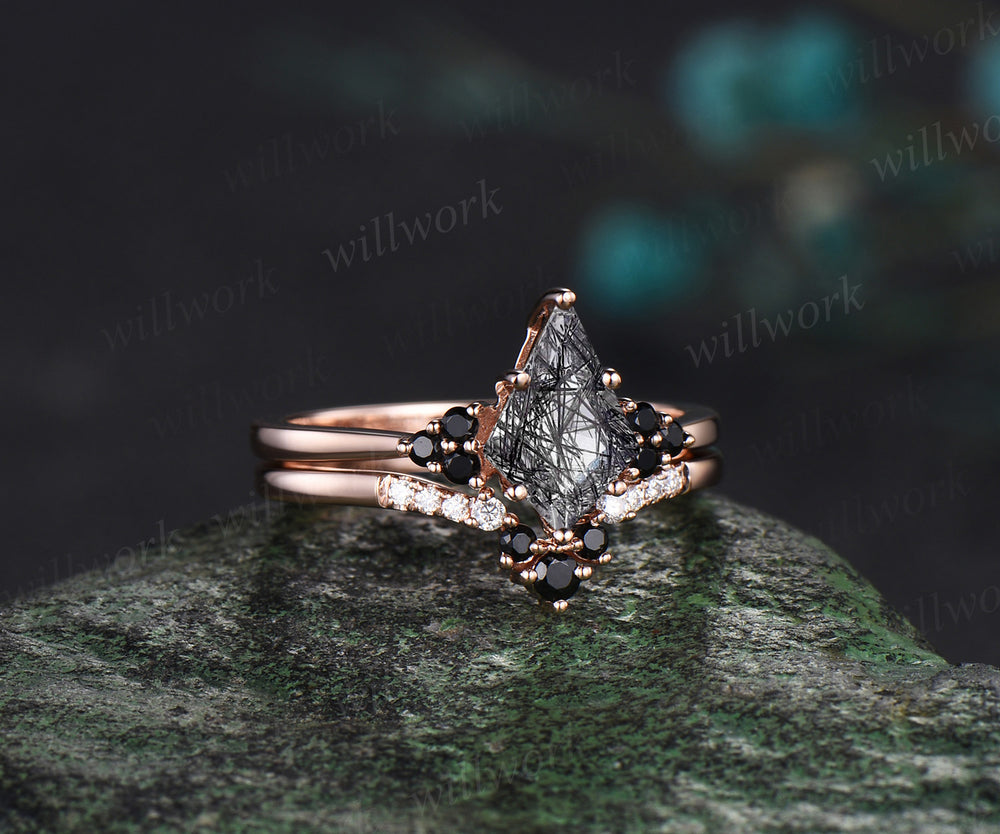 Unique kite cut black rutilated quartz engagement ring solid 14k white gold black spinel moissanite Personalized promise anniversary ring women