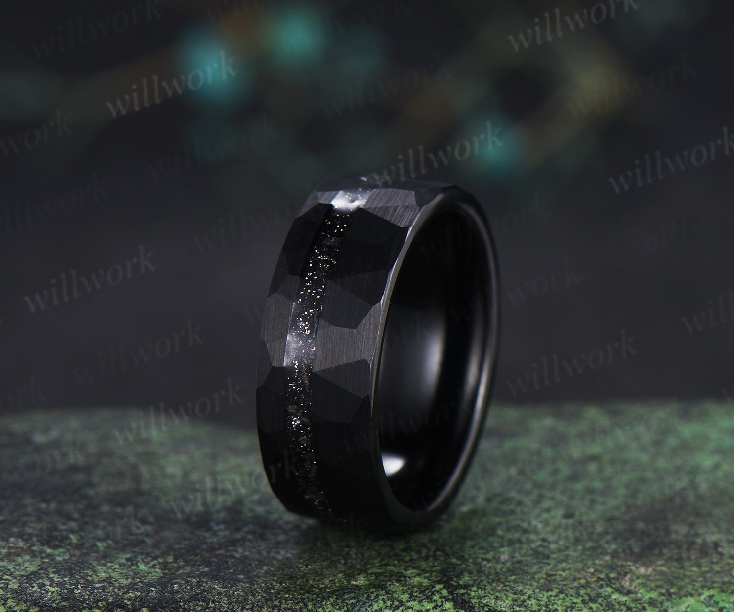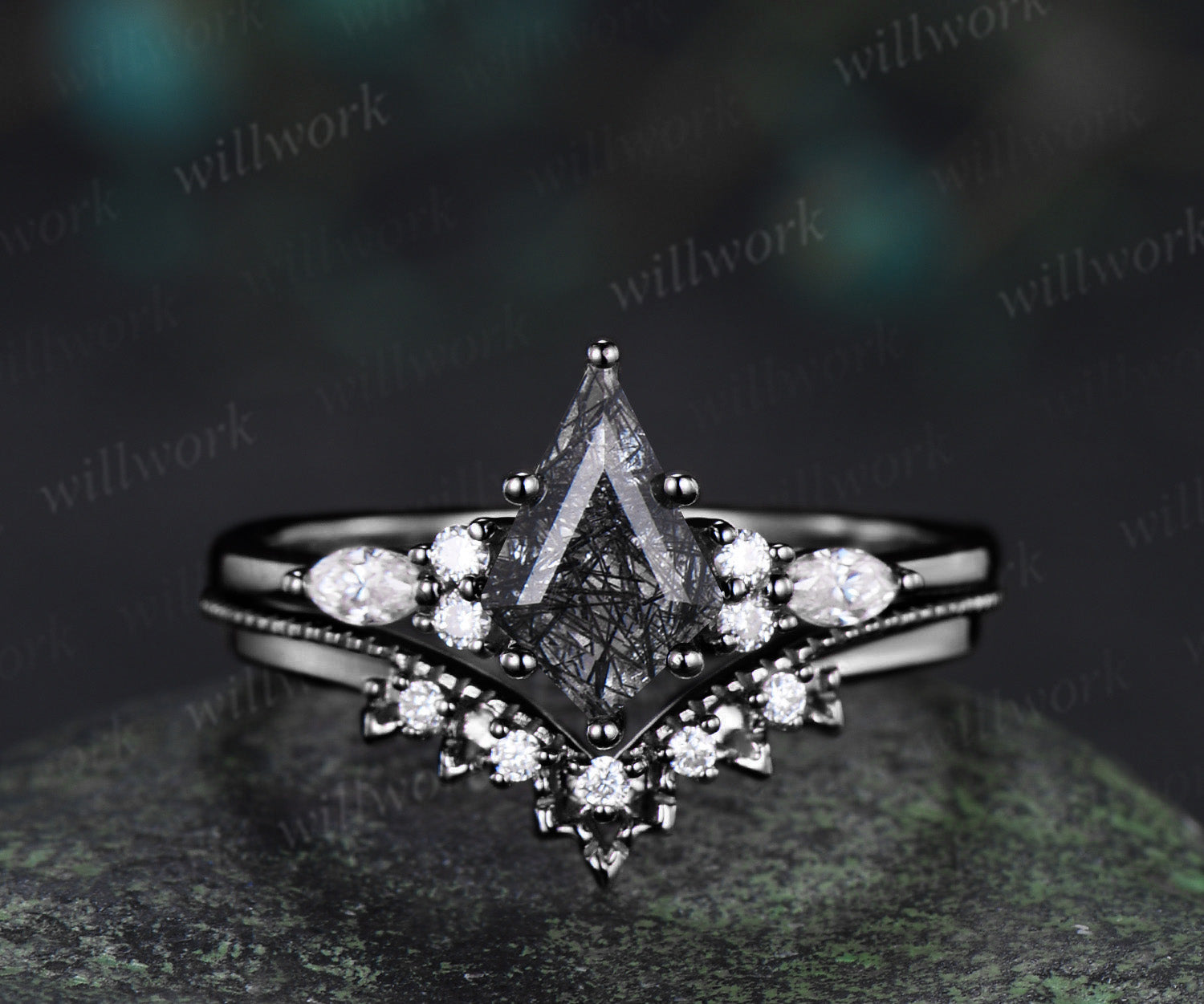 Kite Cut Black Rutilated Quartz Engagement Ring Set & Black Tungsten Hammered Mens Ring His & Her Couple Rings