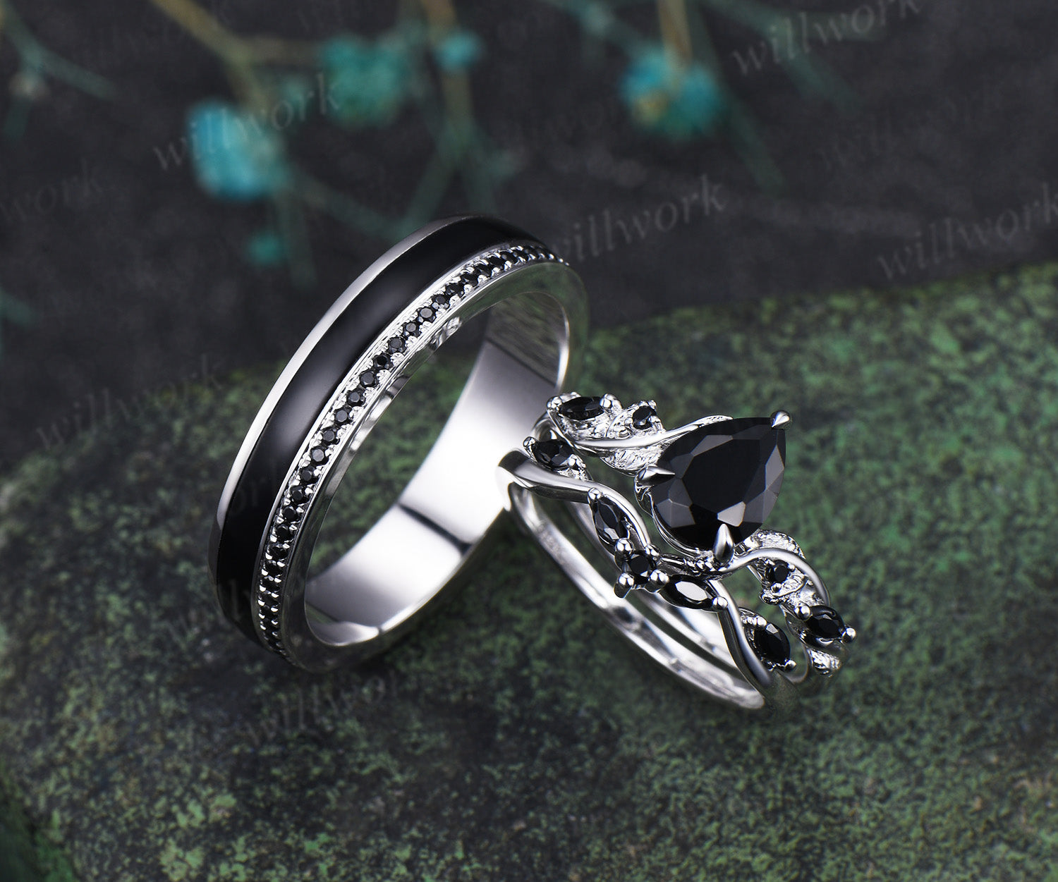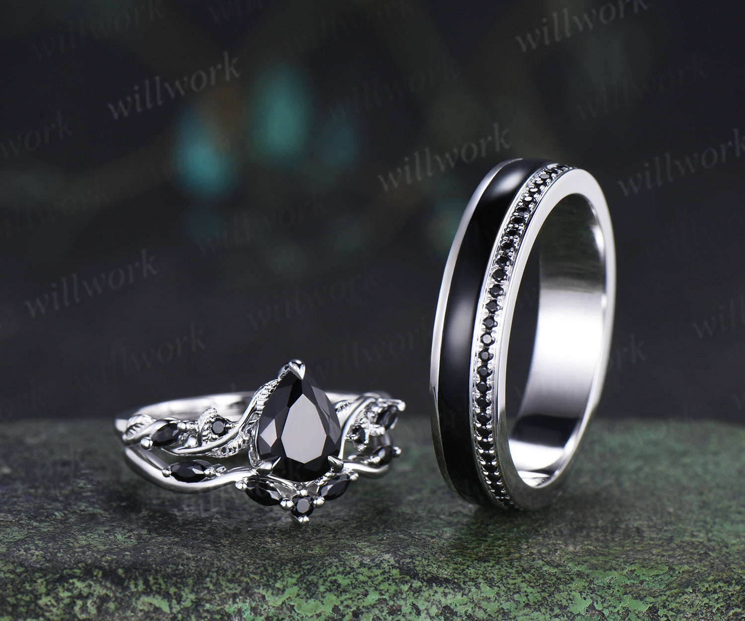 Pear Cut Black Onyx Leaf Twig Bridal Ring Set & Full Eternity Black Onyx Black Spinels Men Ring Unique Couple Ring Set Pear Cut Black Onyx Leaf Twig Bridal Ring Set & Full Eternity Black Onyx Black Spinels Men Ring Unique Couple Ring Set $1,675.00