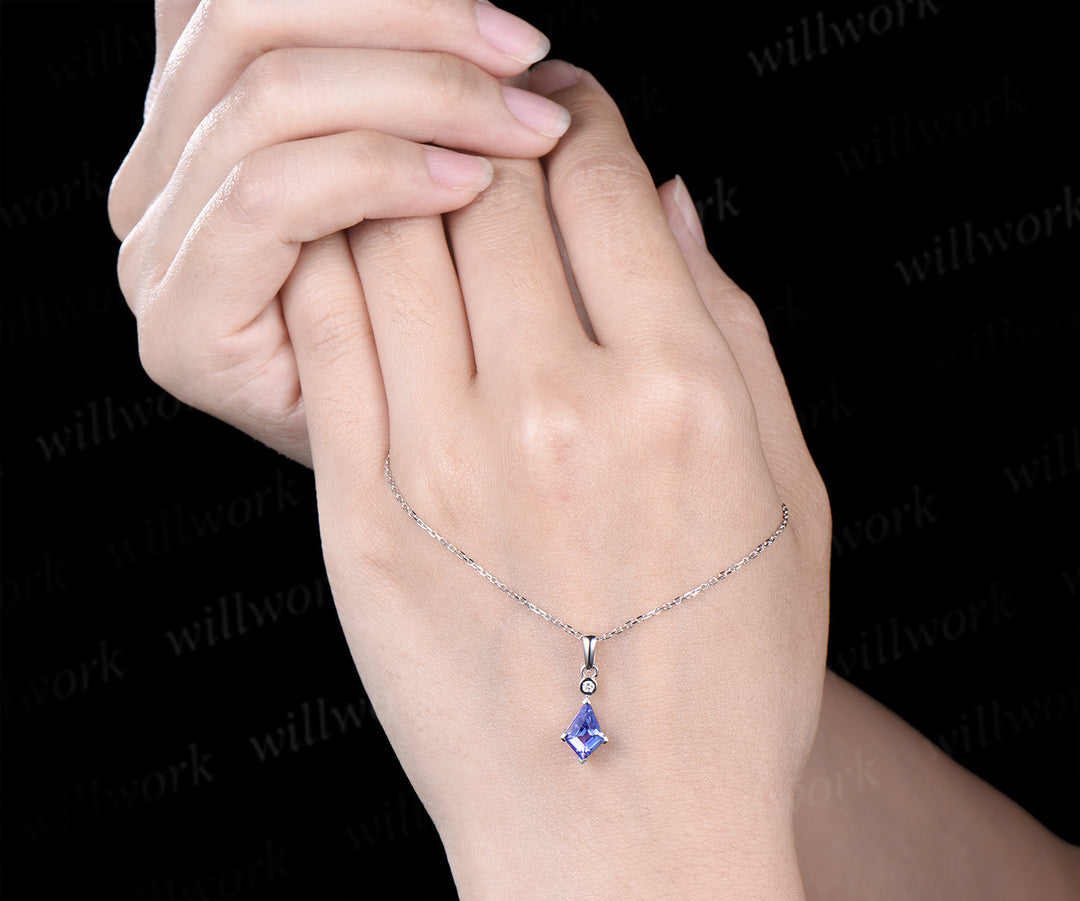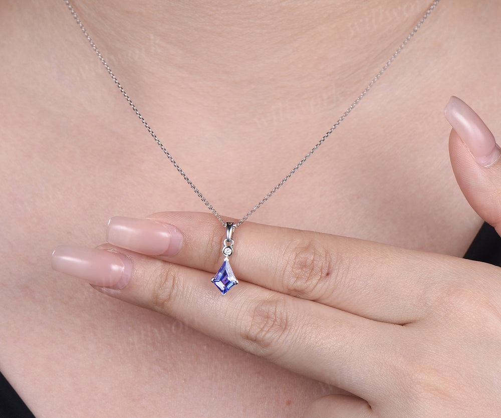 ***Sleek and sophisticated, this minimalist kite cut tanzanite necklace glows with cool elegance, the Art Deco-inspired bezel setting and accent diamond make it a timeless pendant?aperfect for anniversary, birthday, or holiday gifting.***- Metal: Solid gold(9K/14K/18K white/yellow/rose gold),925 sterling silver, platinum available