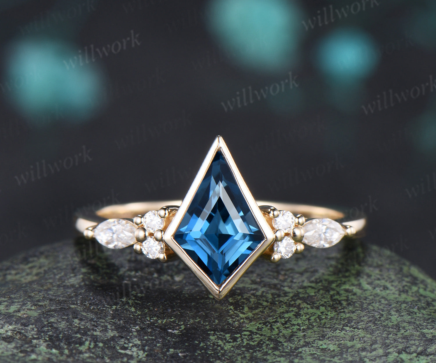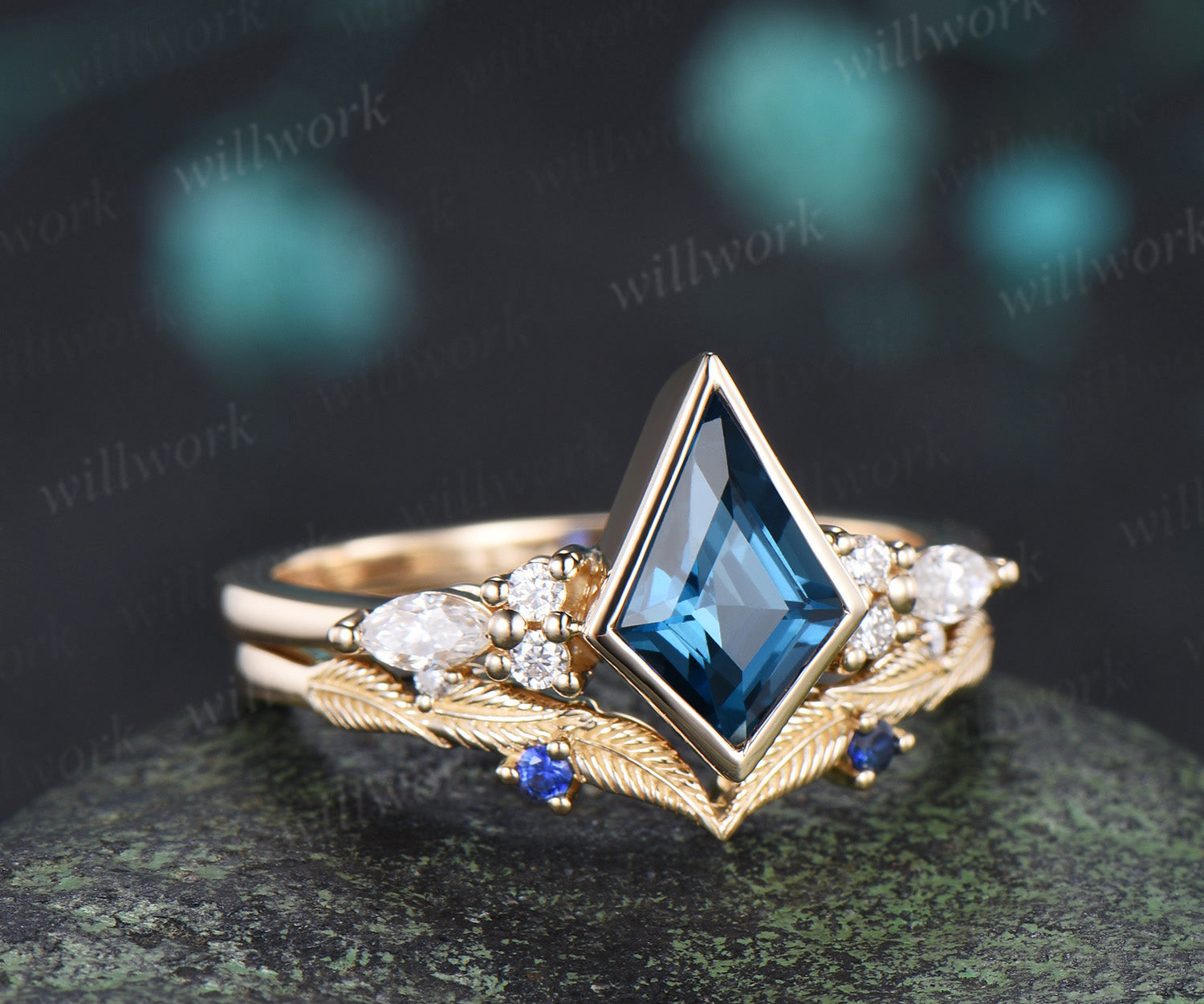 Kite cut London blue topaz engagement ring bezel setting seven stone ring leaf sapphire matching band bridal set