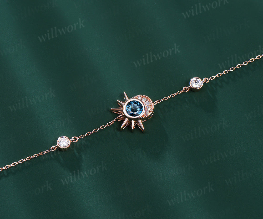 Round Cut Natural London Blue Topaz Bracelet 14k Rose Gold Minimalist Celestial Jewelry Unique Moon Star Sun Bracelet Art Deco Promise Gift