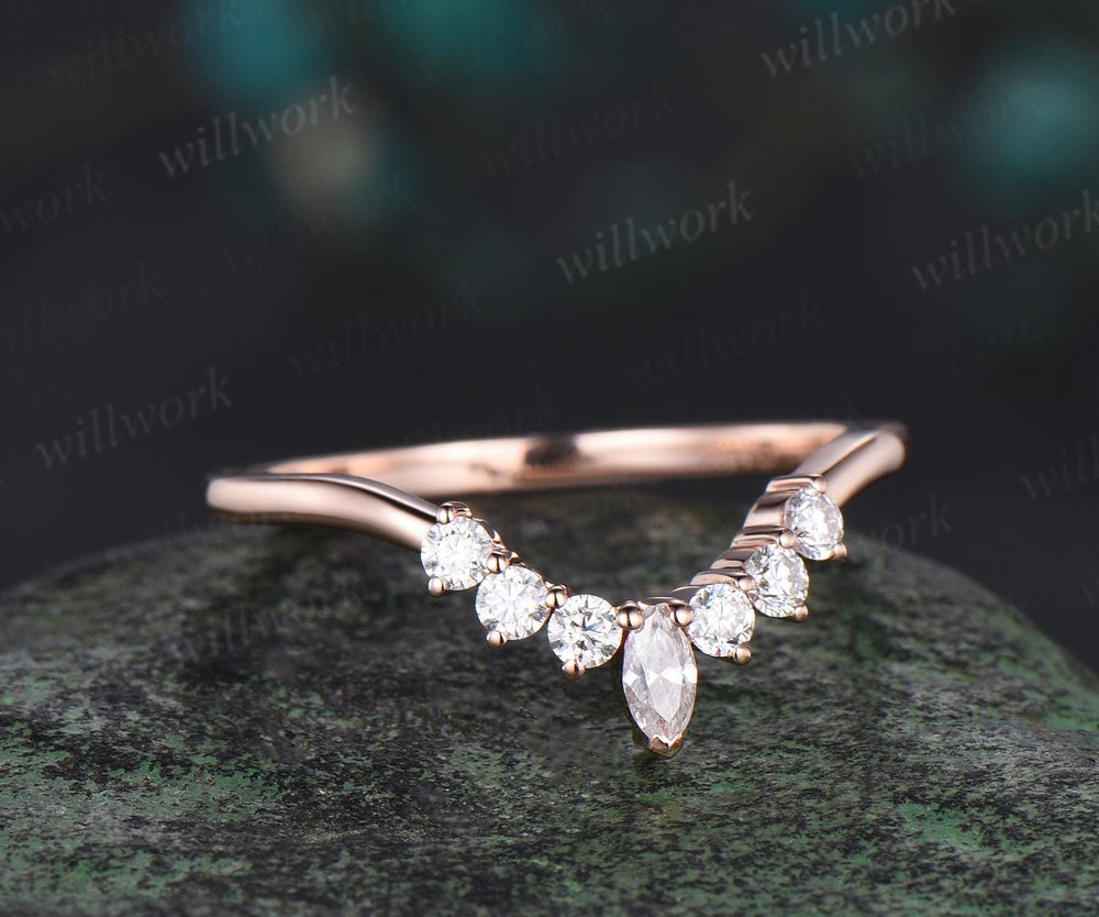 Curved marquise diamond wedding band solid 14k rose gold matching stacking moissanite anniversary ring women gift