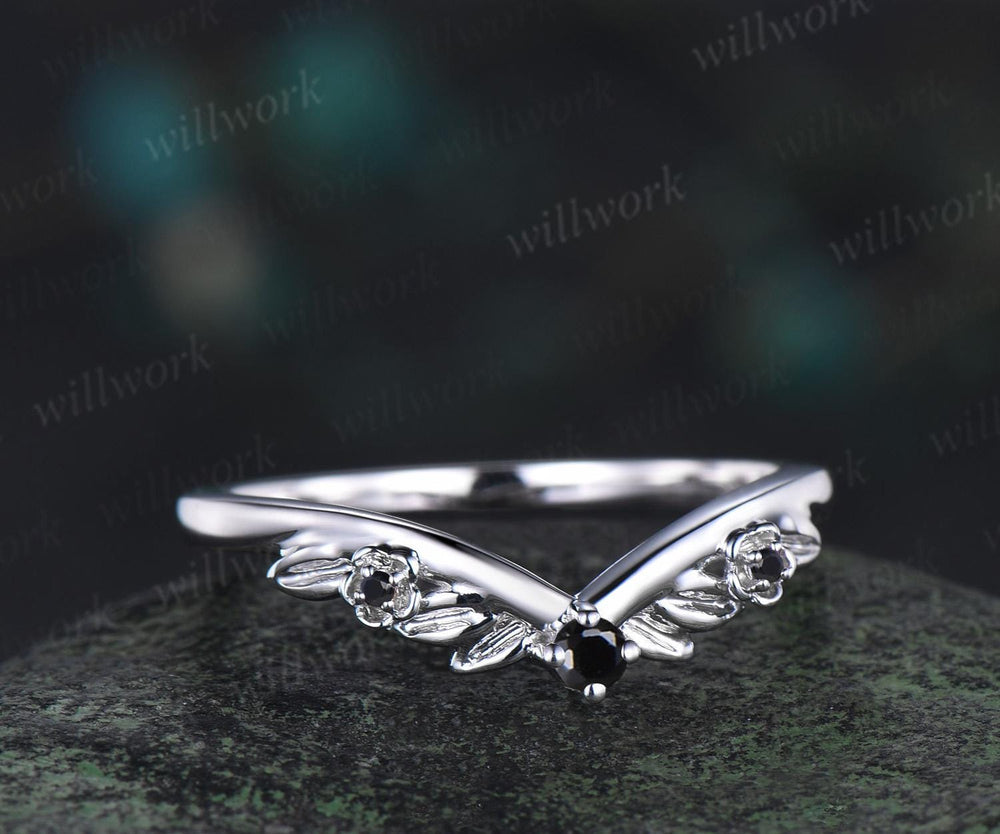 Leaf floral Black diamond curved wedding band solid 14k white gold nature inspired three stone stacking bridal anniversary ring women gift