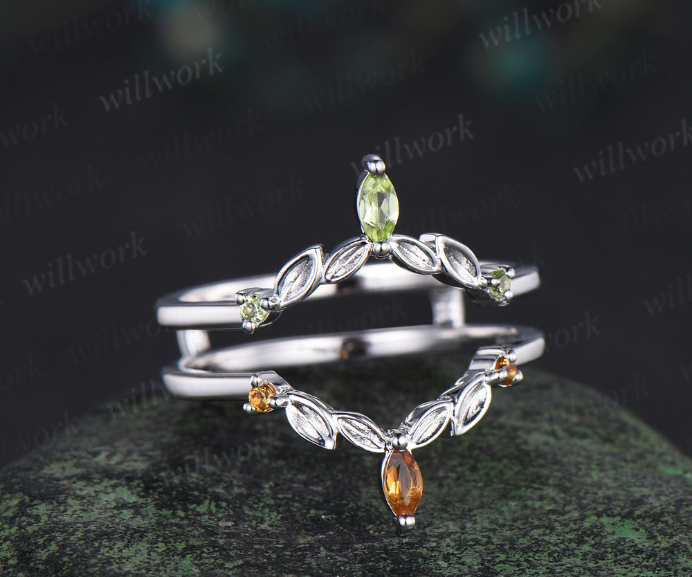 Marquise peridot citrine leaf wedding band double layerd band enhancer wrap white gold curved matching stackable ring