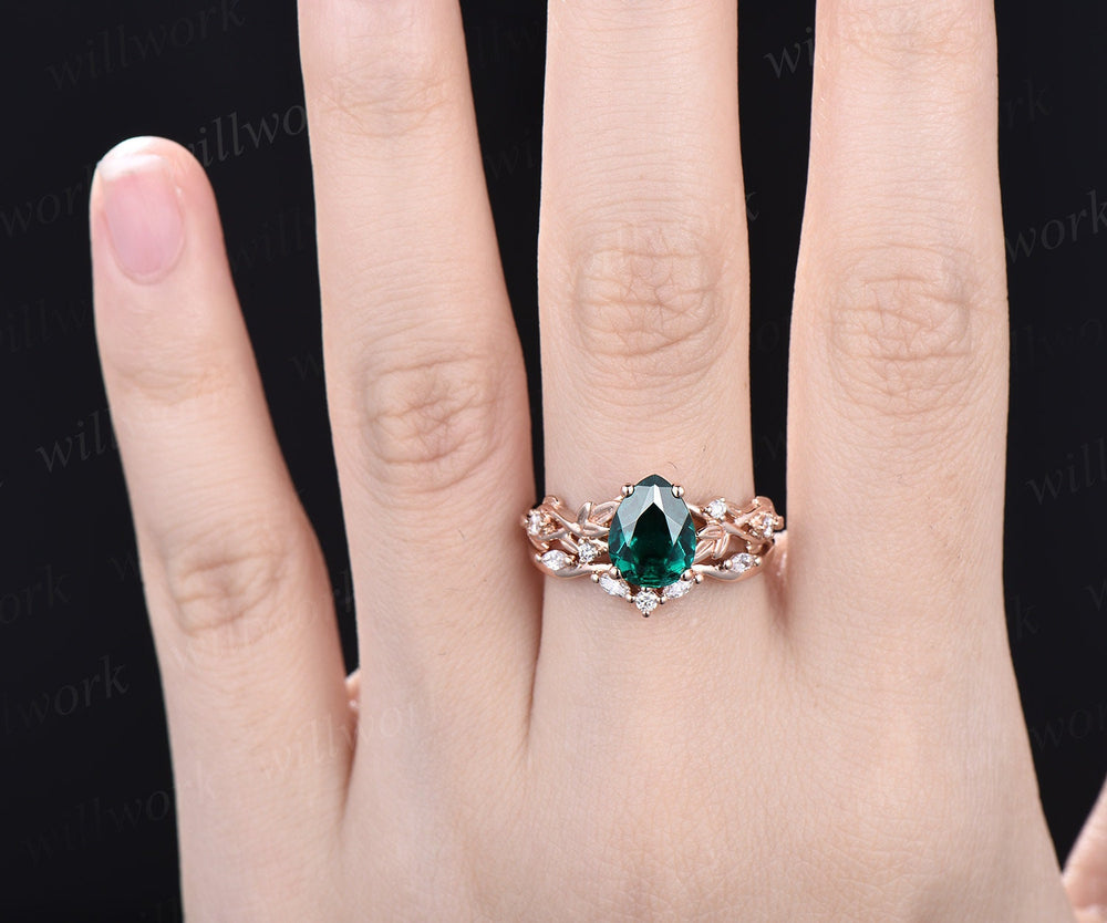 Twig pear shaped emerald engagement ring set 14k rose gold five stone leaf branch Nature inspired ring diamond wedding ring set women gift Twig pear shaped emerald engagement ring set 14k rose gold five stone leaf branch Nature inspired ring diamond wedding ring set women gift $1,086.00