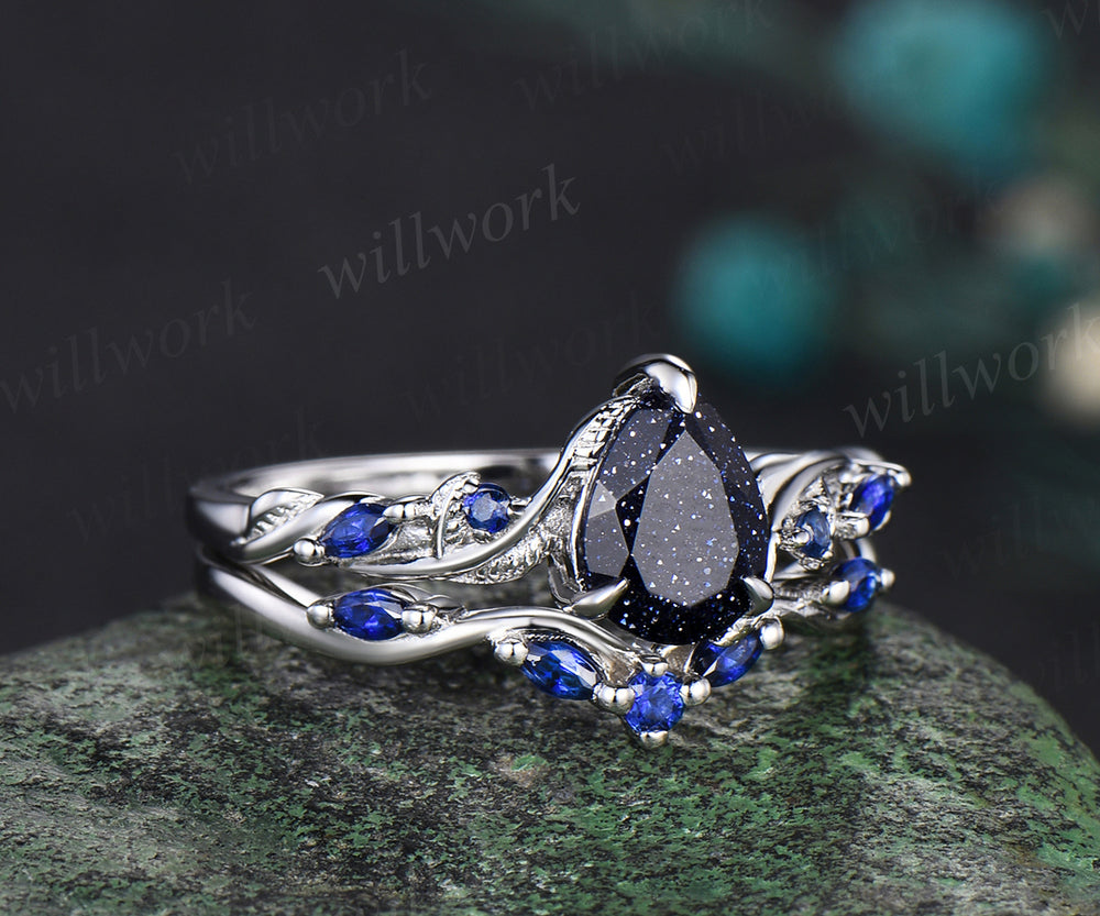 Nature Inspired Pear Galaxy Blue Sandstone sapphire Bridal Set white gold Unique Twig Vine Teardrop Blue Goldstone Engagement Ring Ring Set