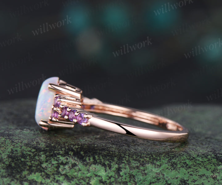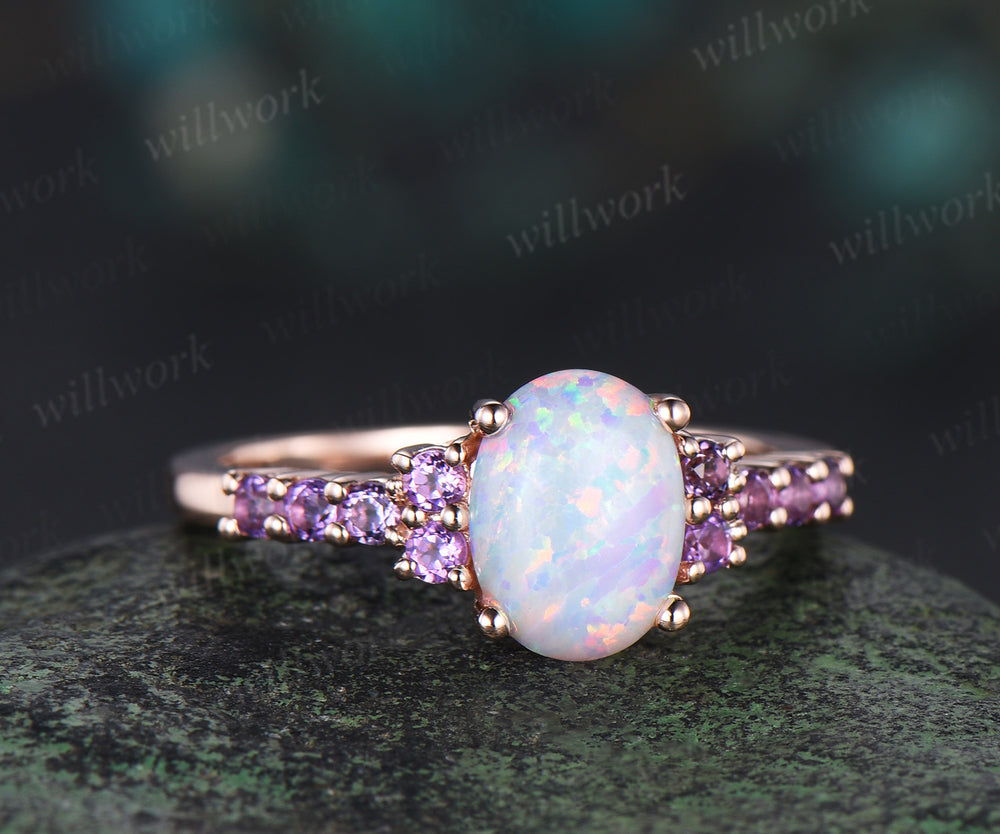 Oval white opal engagement ring vintage solid 14k rose gold half eternity amethyst ring women unique wedding anniversary ring gift