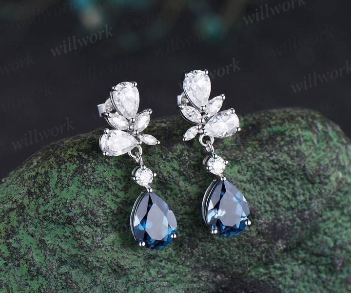 Pear cut London blue topaz earrings solid 14k white gold cluster moissanite opal drop earrings women anniversary gift for her