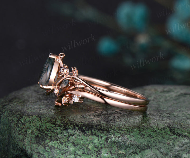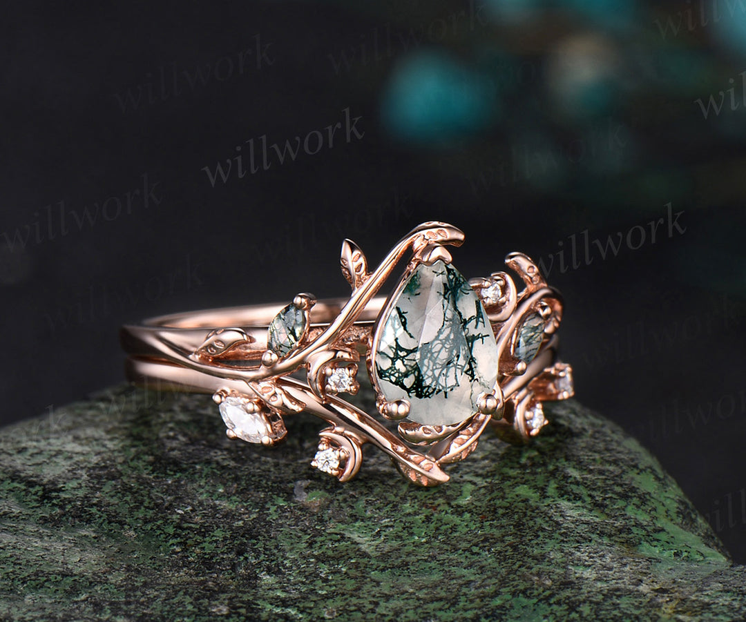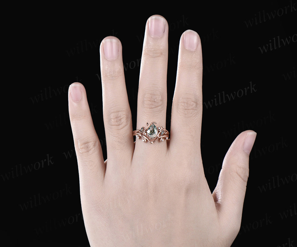 Pear cut moss agate ring vintage rose gold diamond leaf branch moon engagement ring women stacking bridal ring set jewelry
