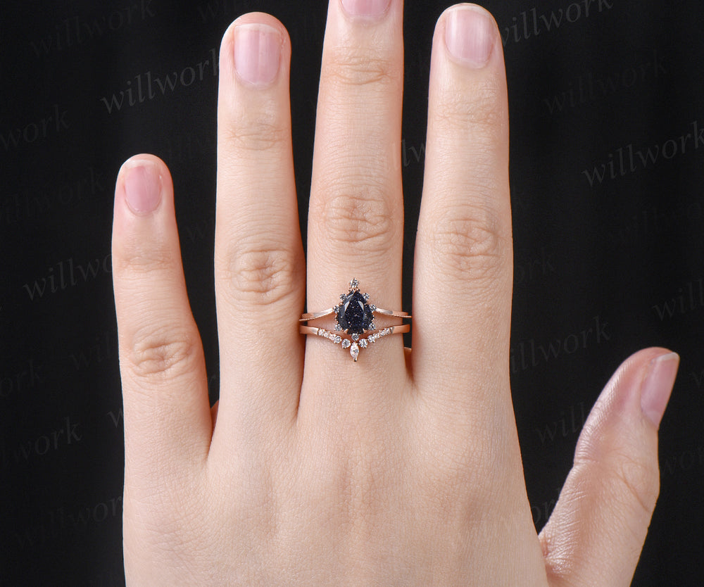 Pear shape blue sandstone engagement ring vintage art deco sandstone ring set solid 14k rose gold moissanite wedding band bridal set jewelry gifts