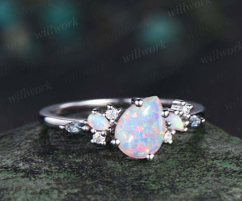 Pear shaped opal engagement ring solid 14k white gold cluster alexandrite ring vintage dainty unique bridal anniversary ring gift