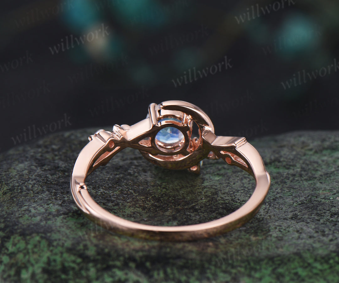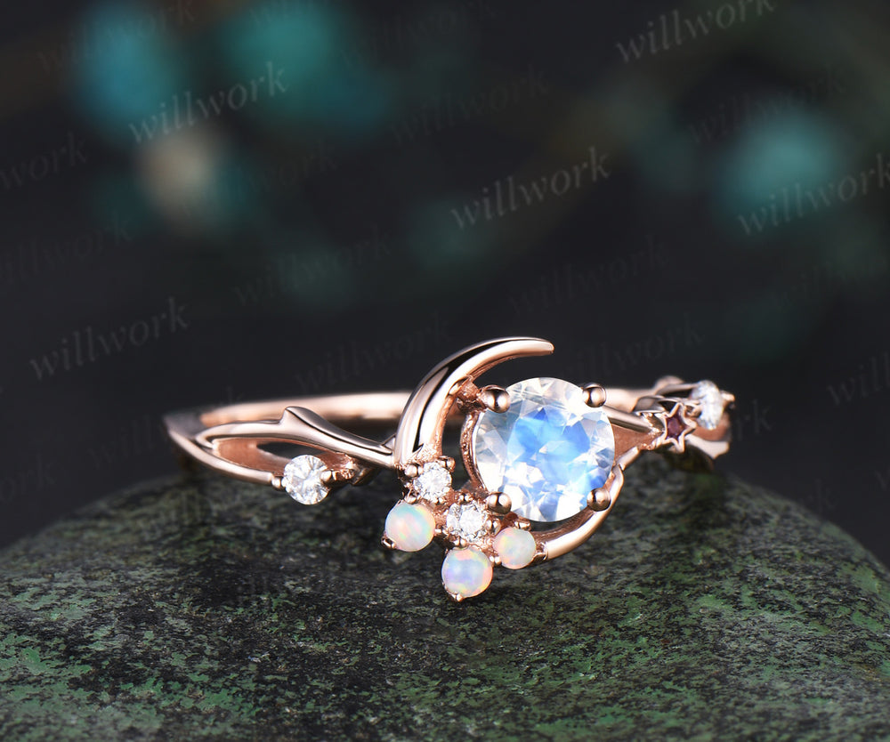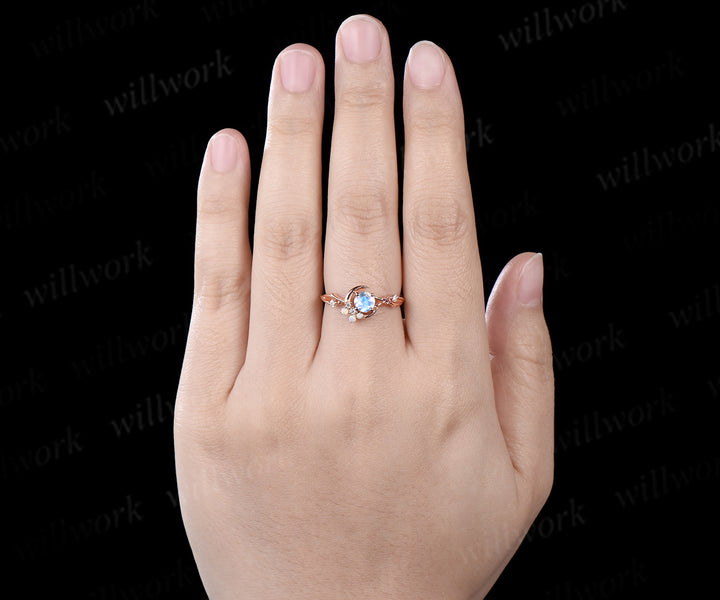 Round cut moonstone Engagement Ring vintage moon cluster opal ring women twig branch star vine moissanite anniversary gift