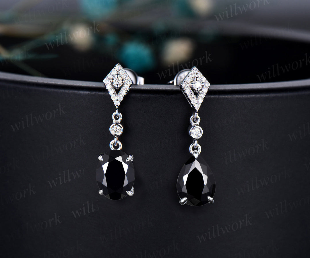 Vintage pear oval cut black onyx earrings women solid 14k 18k white gold dainty kite halo diamond drop earrings anniversary gift for her