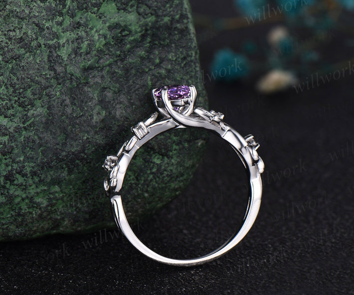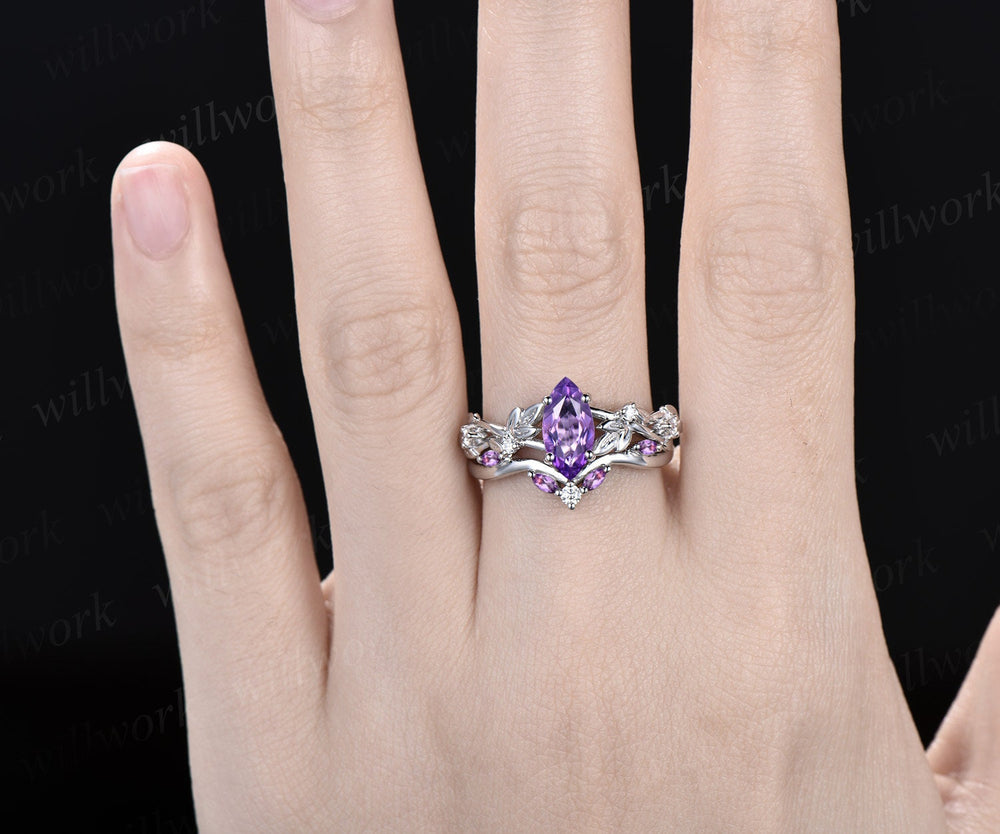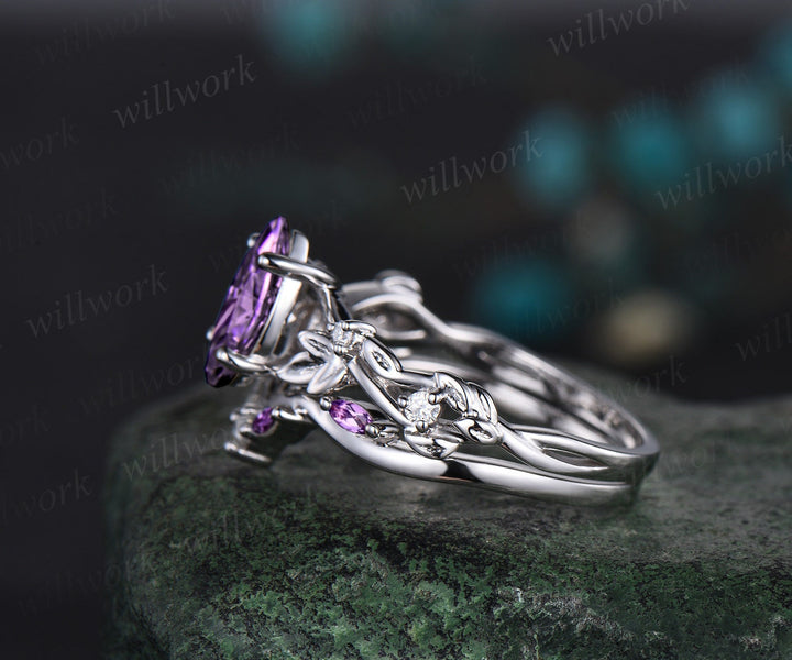 Vintage marquise cut purple amethyst engagement ring women twig leaf Nature inspired white gold ring branch diamond bridal ring set gift