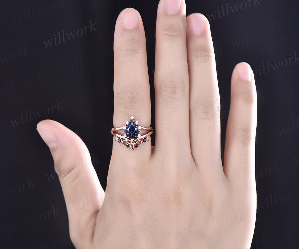Vintage pear shaped blue sandstone engagement ring set rose gold cluster moissanite ring black diamond ring unique wedding ring set women