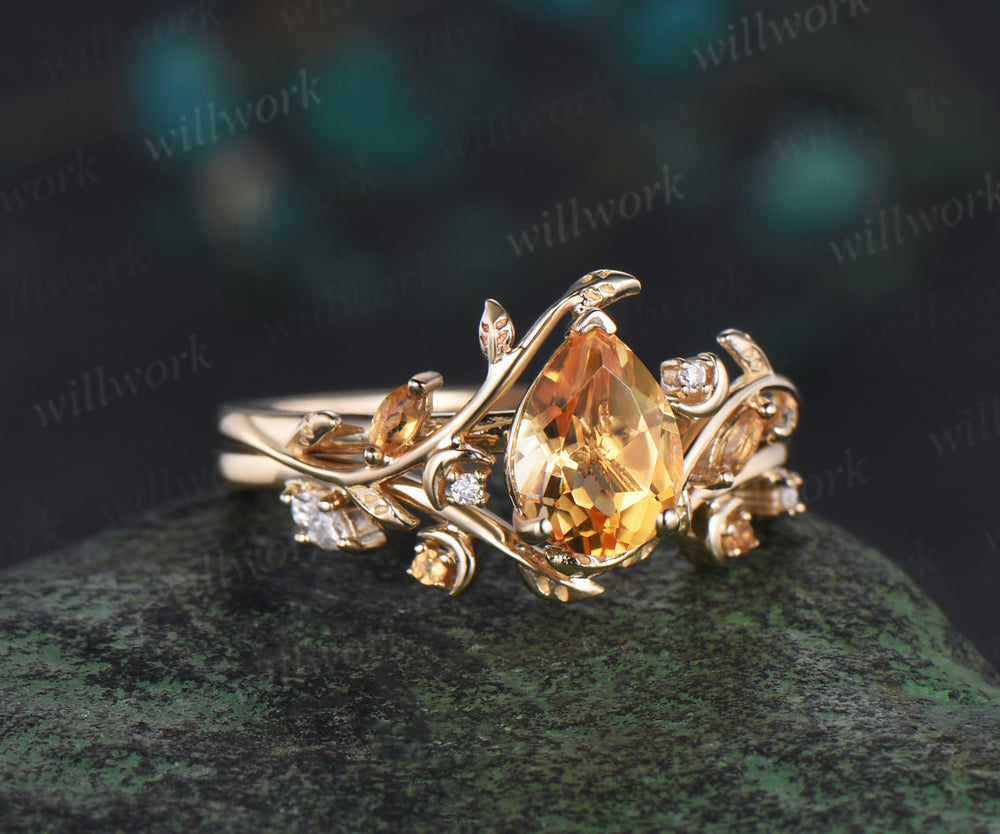 Vintage pear shaped citrine engagement ring yellow gold twisted leaf moon Crystal gemstone wedding anniversary ring set gift