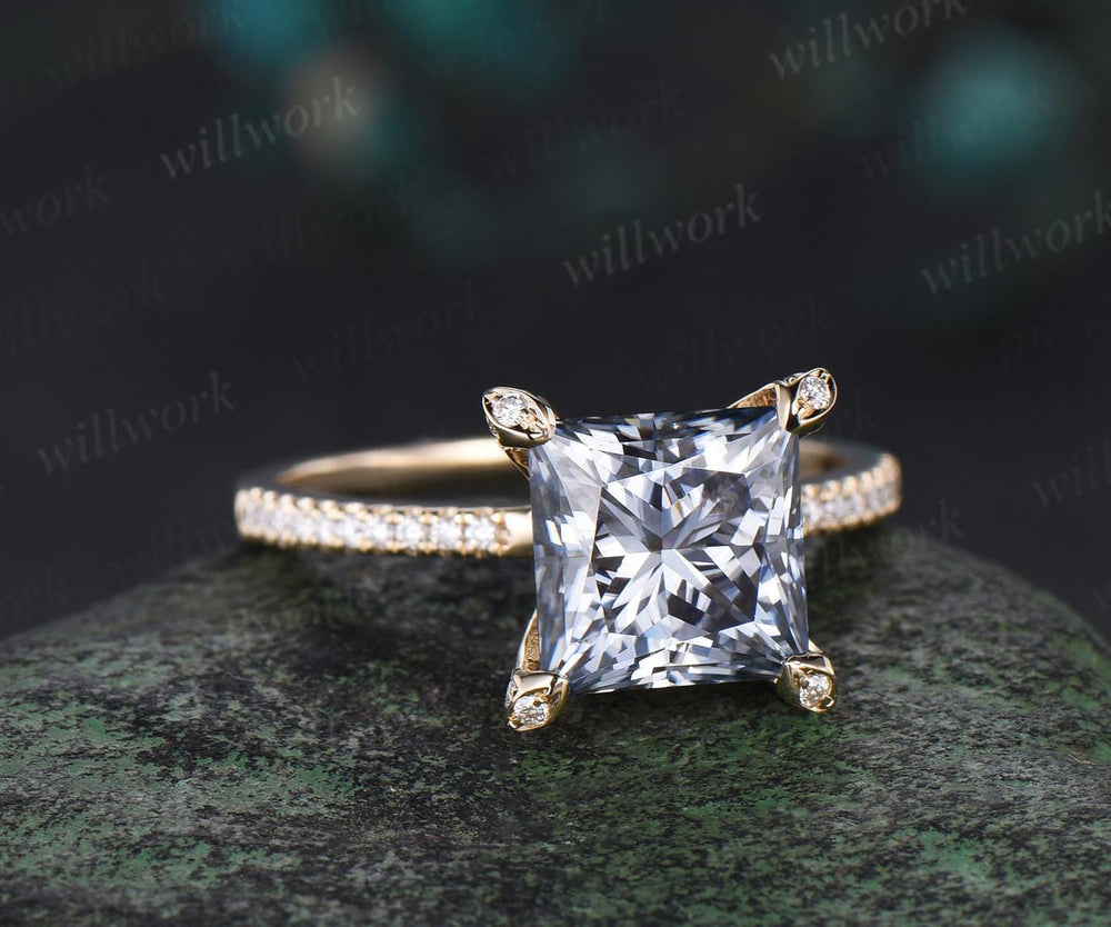 Vintage princess cut gray moissanite engagement ring yellow gold pyramid under halo basket diamond ring women unique promise ring jewelry