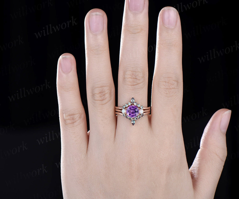 Vintage purple amethyst engagement ring set rose gold three stone opal ring women alexandrite wedding ring set gemstone crystal ring gift