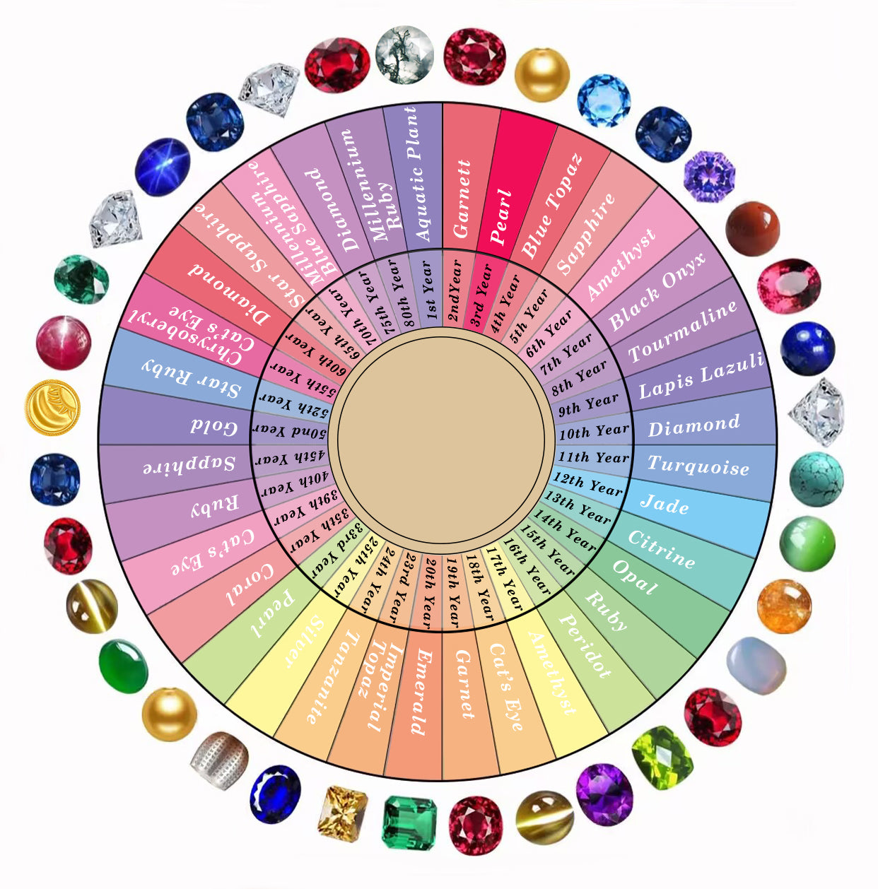 Common traditions include gold for the 1st, garnet for the 2nd, pearl for the 3rd, and diamond for the 10th. These guide many couples in gift selection.
