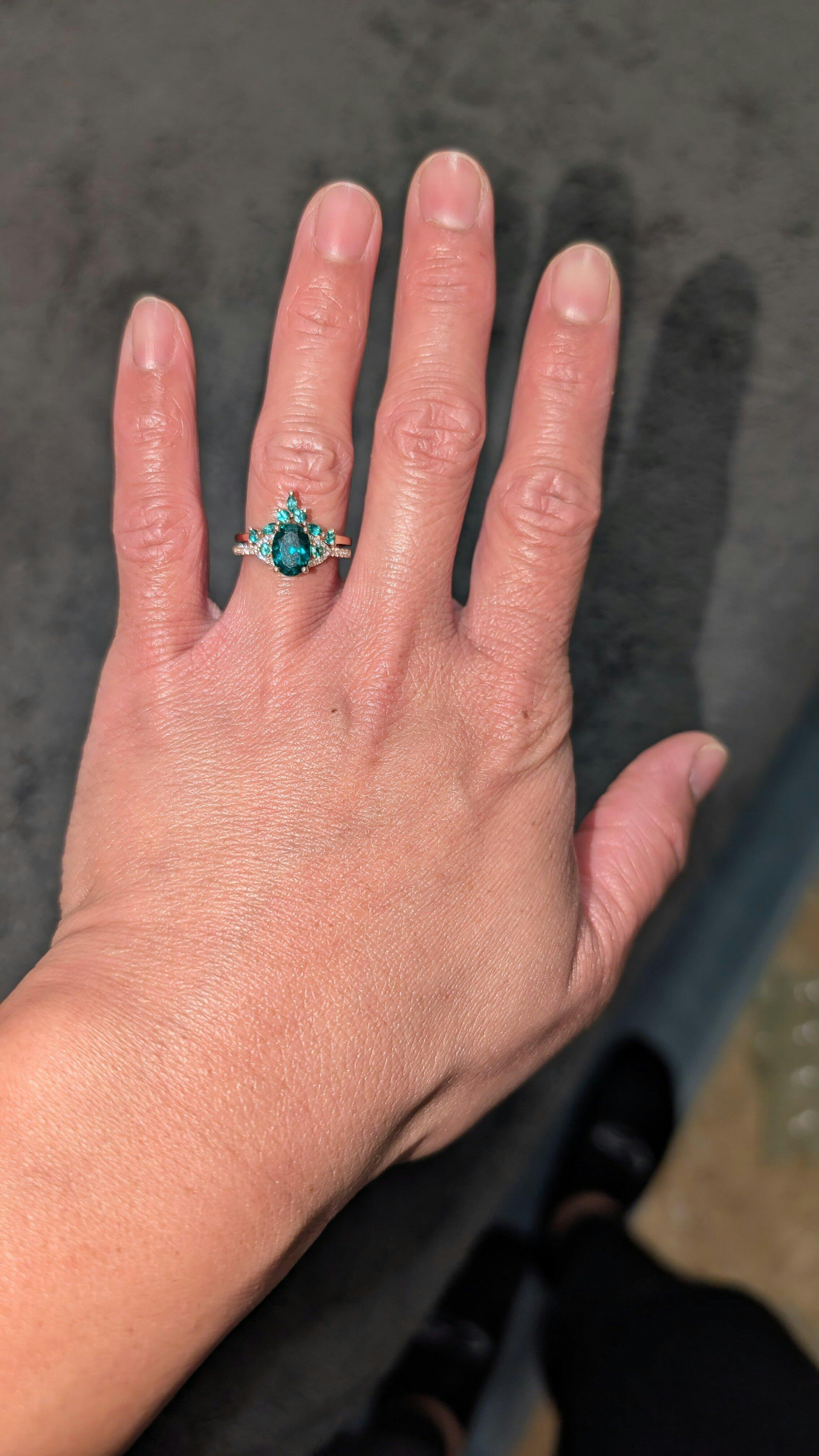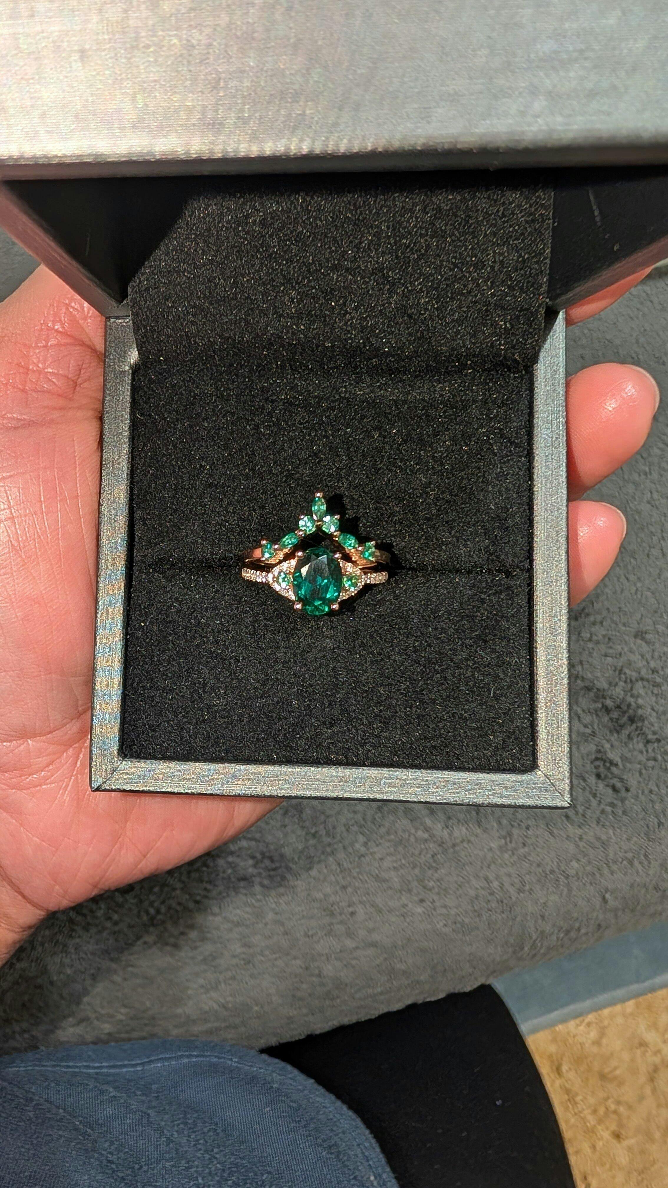I received my lovely ring last week. It is Really dainty, but lovely. It has a bunch of small emeralds nicely placed throughout the ring. With jewelry, you get what you pay for.