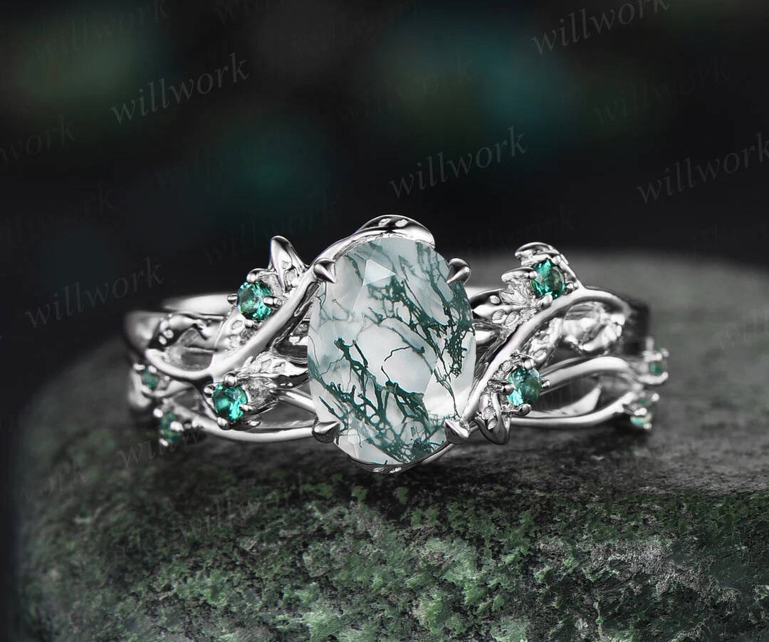 6x8mm oval cut natural moss agate nature inspired engagement ring set 14k rose gold twig leaf ring art deco emerald wedding band bridal set jewelry gifts Anniversary gift